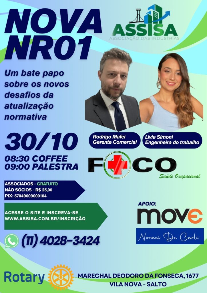 Data: 30/10Horários: 08h30 – Coffee | 09h00 – PalestraLocal: Rotary – Rua Marechal Deodoro da Fonseca, 1677 – Vila Nova, Salto/SP PalestrantesFoco Saúde Ocupacional Rodrigo Mafei – Gerente Comercial Lívia Simoni – Engenheira do Trabalho Estamos promovendo um encontro prático para explicar o que muda com a Nova NR01 e como as empresas podem se […]